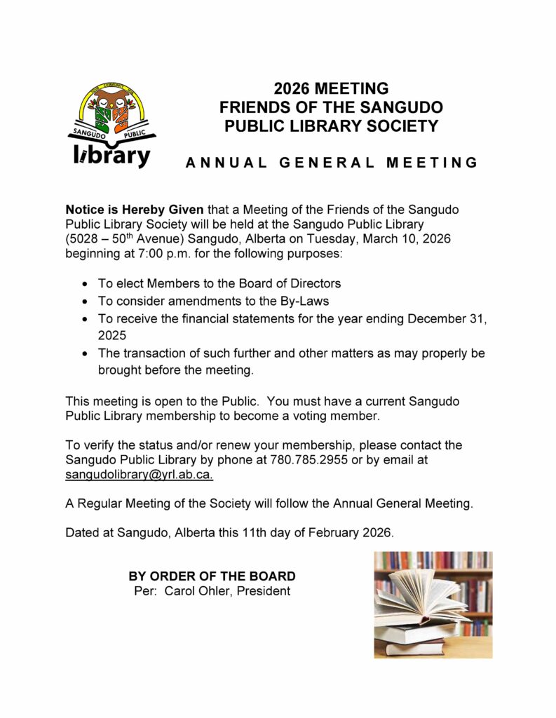 The Friends of the Sangudo Public Society is a volunteer-run organization that oversees the operational framework of the Sangudo Public Library.